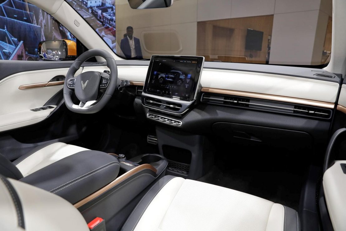 Bước vào khoang lái, khách hàng sẽ ấn tượng ngay với màn hình giải trí cảm ứng trung kích thước 12.9 inch nằm ngang có khả năng điều chỉnh gần như mọi tính năng trên xe. Các nút bấm chuyển số được bố trí theo phương ngang dưới cửa gió điều hoà không đụng hàng với đối thủ nào, mang đến trải nghiệm mới mẻ.
